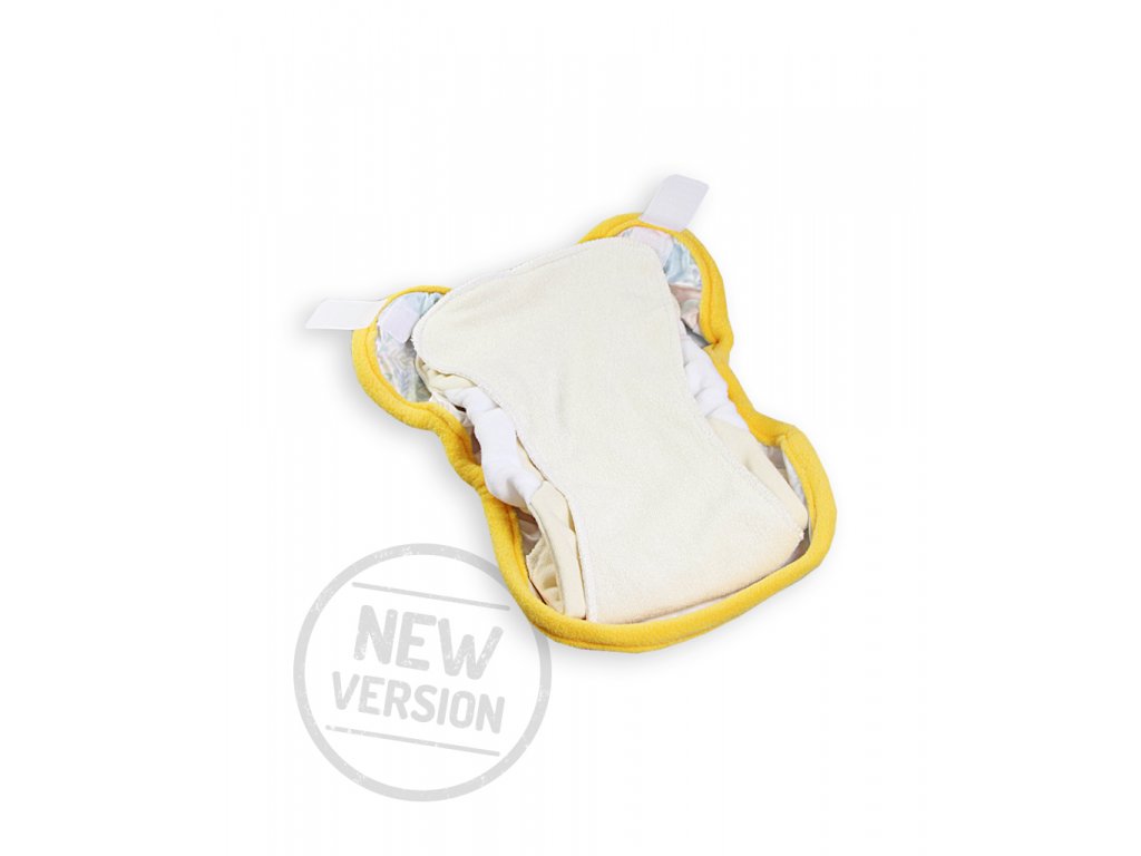 Tato nová verze základny je ve zcela novém střihu, který je zúžený v zadní části a vzhledem k použitému materiálu (české bambusové BIO froté) je zachována jeho špičková savost. Díky zmenšenému objemu dětem „dělá menší zadeček” a umožňuje větší rozsah pohybu.