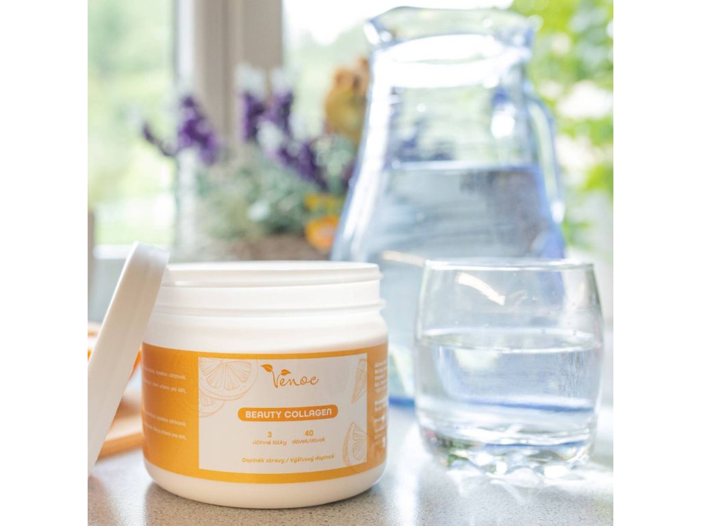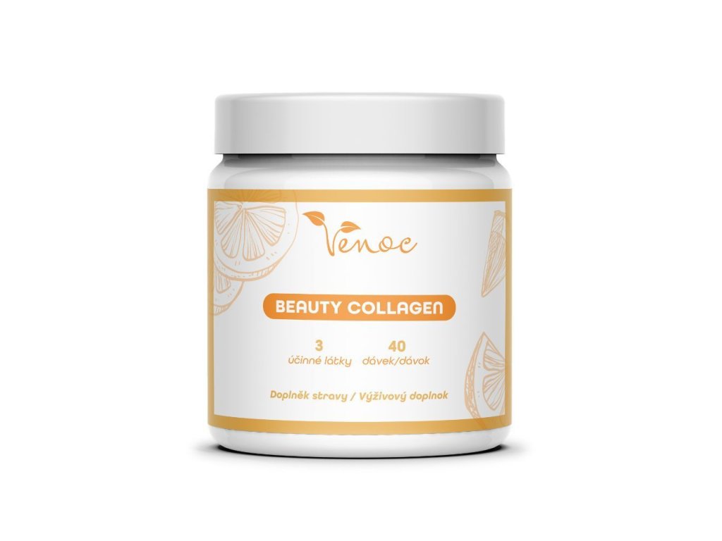 Trápí vás lámavost a nízká kvalita nehtů? Toužíte po výživné a pružné pokožce? Chtěli byste podpořit růst vlasů či výživu chrupavek, vazů a šlach? Máme pro vás skvělý produkt, který vás zbaví všech zmíněných problémů a ještě mnohem víc! Beauty Collagen od značky Venoc podporuje nejen přirozenou krásu, ale také celkové zdraví! Obsahuje kombinaci 3 účinných látek a jeho jemná pomerančová příchuť vás okouzlí již při prvním doušku. Aktivní látky obsažené v kolagenu napomáhají k normální tvorbě kolagenu, působí jako antioxidant a představují nepostradatelnou součást pojivových tkání.
