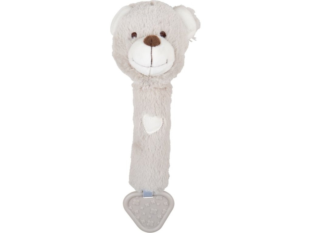 Chrastítko, pískátko a kousátko v jednom. Tento super měkký medvídek byl vyroben za použití měkkých a bezpečných materiálů, které jsou laskavé k dětské pokožce. Hračka je designována tak, aby dětem pomohla při rozvoji, bude perfektním dárkem pro novorozeňata. Děti mohou ulevit svým dásním na robustním kousátku nebo hračku mohou zmáčknout a ona zapíská! Hlavní vlastnosti: hračka má neutrální barvuperfektní velikost pro dětské rucevyrobeno z kvalitních materiálů ze zodpovědných zdrojůsplňuje evropské bezpečnostní standardyvhodné již od narození