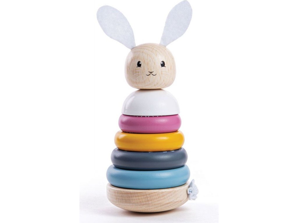 Barevné a krásné nasazovací kruhy ze 100% FSC® dřeva nadchnou všechny zvídavé děti. Roztomilý design se zajíčkem v pastelových barvách bude pomocníkem při rozvoji zručnosti a rozpoznávání barev.Zajíček má plstěná ouška a ocas, děti se díky tomuto detailu naučí o rozdílných texturách, je to tedy také hmatová hračka. Děti budou kroužky skládat od největšího po nejmenší na středovou tyč. Ta je k základně připevněná gumičkou, je ohybatelná a tím pádem i bezpečná. Tato nasazovačka je vyrobena ze 100% FSC® materiálů, to znamená, že vybrané dřevo je co nejvíce udržitelné. Hlavní vlastnosti: 7 nasazovacích kroužků100% FSC® dřevovhodné od 12 měsícůlehká a odolná hračka Značka a certifikát FSC® (Forest Stewardship Council) zaručuje, že dřevo, ze kterého byl produkt vyroben, nebylo vytěženo nelegálně a pochází z lesů obhospodařovaných šetrným či přírodě blízkým způsobem, ve kterém jsou dodržovány přísné environmentální a sociální požadavky. Značka FSC® na výrobku znamená, že svým nákupem pomáháte chránit lesy a podporujete šetrné, odpovědné či přírodě blízké hospodaření, díky kterému jsou naše lesy stabilnější, zdravější, mají přirozenou druhovou skladbu a lépe odolávají negativním následkům klimatických změn.