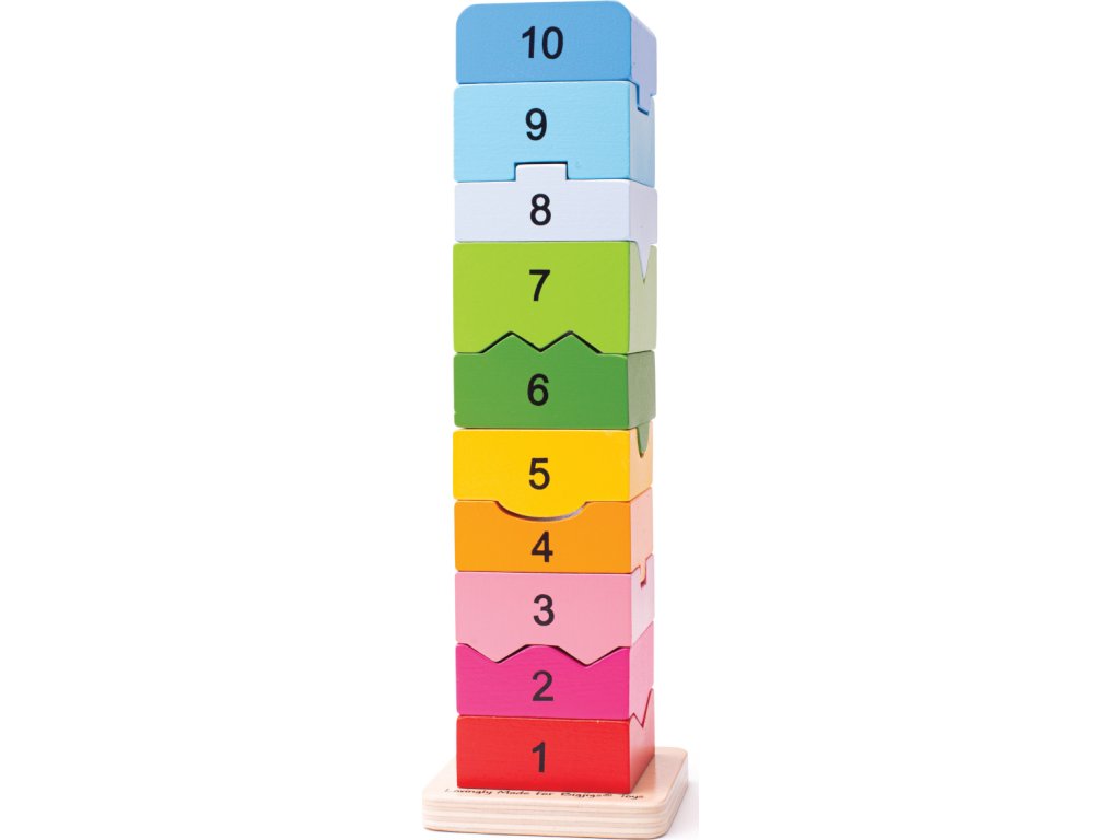 Stavěj věž a počítej bloky. Tak by se dala nazvat tato dřevěná očíslovaná věž v mnoha barvách, kde má každý barevný blok své číslo a vaše dítě se při jeho stavbě učí, jak napočítat od jedné do deseti. Jednotlivé bloky jsou skládačkového typu, dítě se tak učí dávat správné tvary k sobě. Každá jednotlivá kostka má specifický tvar, takže do sebe zapadají jen tak, jak jsou očíslovány. Bez středové tyče. Vyrobeno z vysoce kvalitních materiálů ze zodpovědných zdrojů. Vyhovuje současným evropským bezpečnostním normám. Obsahuje 11 dílů. Hlavní vlastnosti: procvičuje rozpoznávání čísel a počítáníobsahuje 11 dílůbloky jsou skládačkového typu, zapadají do sebe jen správné tvary