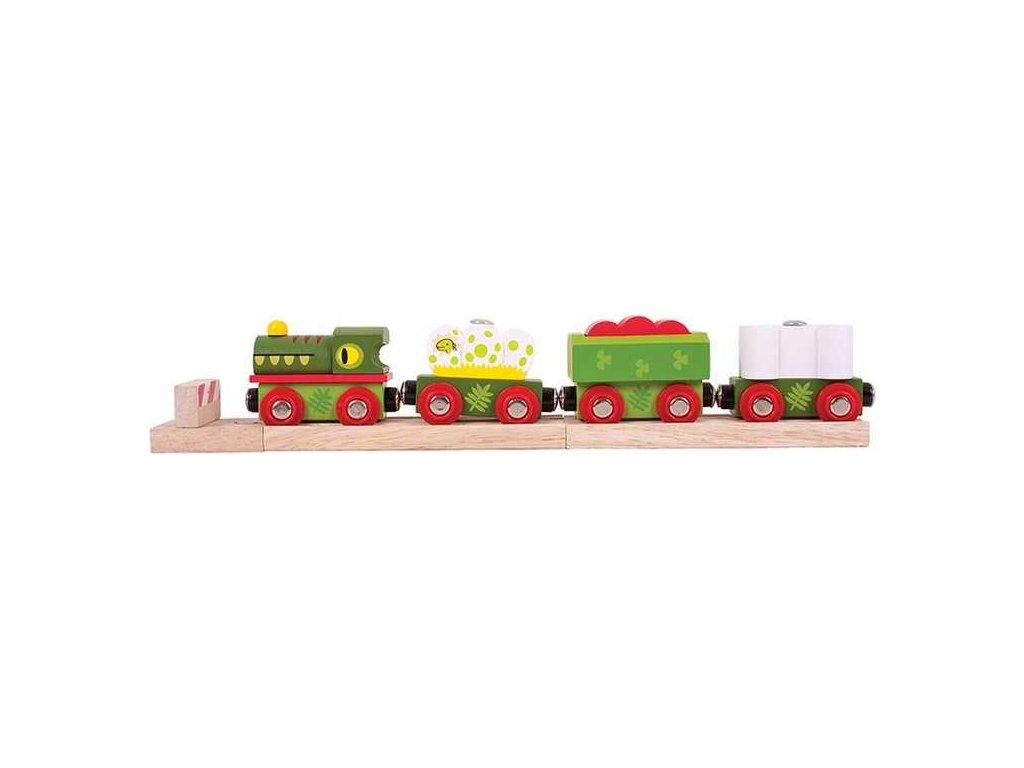 Součásti balení jsou také koleje: 2ks střední kolej BJT101 a 1ks koncová kolej BJT161!Děti budou milovat tento jasný a veselý set dinosauřího vlaku, který zahrnuje tři vagónky, kolejnice a chytrou lokomotivu. Magnetická spojka vagónků také znamená, že mohou být snadno propojeny s dalšími kusy. Hlavní vlastnosti: vláčkodráhy a jejich příslušenství značky Bigjigs Rail je možno kombinovat se všemi dalšími dřevěnými vláčkodráhami na trhuvyrobeno z kvalitních a zodpovědně získaných přírodních materiálůodpovídá současným evropským bezpečnostním normámpodporuje představivost, obratnost a koordinaci