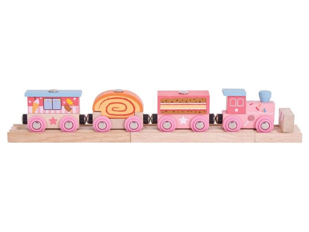 Součástí balení jsou také koleje: 2ks střední kolej BJT101 a 1ks koncová kolej BJT161!Holčičky a nejen ty budou milovat tento veselý dřevěný vláček, který byl pro ně speciálně navržen v růžových barvách. Ideální vlaková souprava obsahující lokomotivu a tři detailně provedené vagónky spojené klasickým magnetickým systémem! Vláček lze kombinovat s jakýmkoliv jiným dřevěným železničním systémem. Hlavní vlastnosti: Vláčkodráhy a jejich příslušenství značky Bigjigs Rail je možno kombinovat se všemi dalšími dřevěnými vláčkodráhami na trhu.Vyrobeno z kvalitních a zodpovědně získaných přírodních materiálů.Odpovídá současným evropským bezpečnostním normám.Podporuje představivost, obratnost a koordinaci.