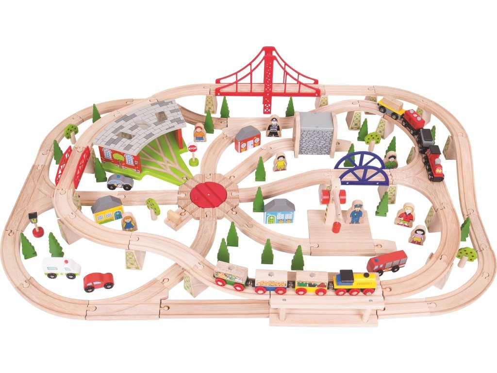 Tento dřevěný set bude Vaše děti inspirovat a vzdělávat. Obsahuje 133 hracích dílků.  Vlakové otočné depo, které dovolí všem vlakům vrátit se zpět až dokončí každodenní trasy. Velký červený most jako v San Francisku nabídne pohled na celé městečko. Součástí bohaté vláčkodráhy je víceúrovňový set kolejí, mosty, stromy, lampy, budovy, figurky policistů a občanů, dvě vlakové soupravy, automobily a další vybavení.  Hlavní vlastnosti: vláčkodráhy a jejich příslušenství značky Bigjigs Rail je možné kombinovat se všemi dalšími dřevěnými vláčkodráhami na trhuvyrobeno z kvalitních a zodpovědně získaných přírodních materiálůodpovídá současným evropským bezpečnostním normámpodporuje představivost, obratnost a koordinaci