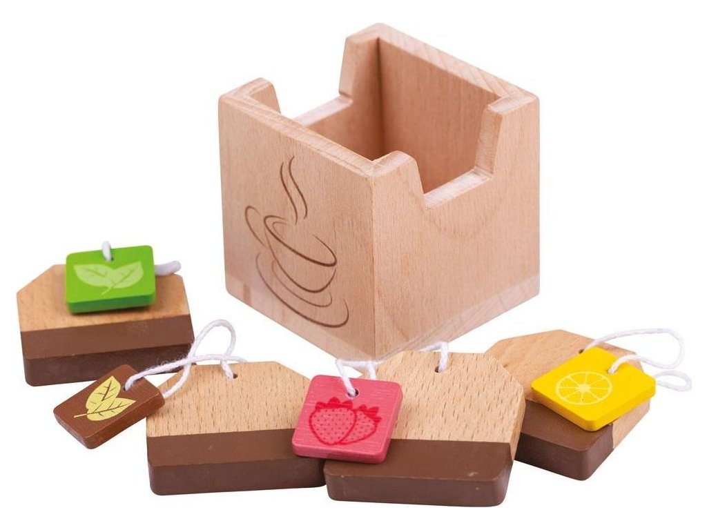 Pořádáte čajový dýchánek? Děti mohou s touto hračkou svým hostům nabídnout různé příchutě čaje. Tyto jedinečně stylizované čajové sáčky nabízí příchutě jako citrón, jahoda a máta. Set je dodáván v jednoduchém dřevěném boxu, do kterého se mohou čajové sáčky po skončení dýchánku uložit. Krásná hračka, která doplní dětskou kuchyňku nebo obchod. Hlavní vlastnosti: podporuje děti k představivé hře rozvíjí jemnou i hrubou motorikuskvělý způsob, jak děti naučit sociální dovednosti a mravyvyrobeno z kvalitních materiálů z odpovědných zdrojůodpovídá evropské bezbečnostní normě