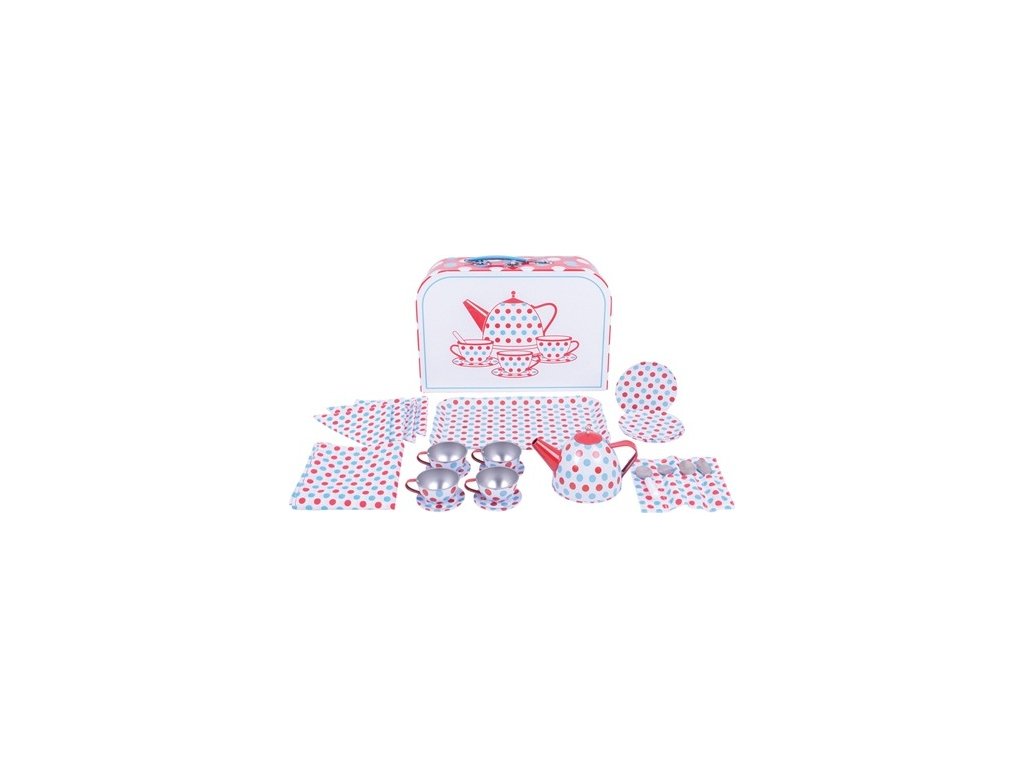Tato nádherná puntíkovaná kovová čajová sada je pestře zbarvená a je dodávána s praktickým přenosným kufříkem! Obsahuje čtyři šálky a podšálky, čajovou konvici s odnímatelným víkem a tác. Také prostírání, sadu ginghamových ubrousků a čtyři lžičky ve vlastním ginghamovém obalu. Tato sada obsahuje vše, co vaše ratolest potřebuje k uspořádání dokonalého čajového večírku pro přátele nebo rodinu. Díky praktickému kufříku je také skvělým společníkem na cesty a znamená to, že váš malý hostitel může zajistit, že sada bude bezpečně uložena, když ji nepoužíváte. Skvělý způsob, jak podpořit kreativní a nápadité hraní. Hlavní vlastnosti: obsahuje čajovou konvici, šálky, podšálky, prostírání, lžičky a tácsplňuje aktuální evropské bezpečnostní normypodporuje kreativitu a nápaditostrozvíjí sociální dovednostizlepšuje obratnost a motoriku