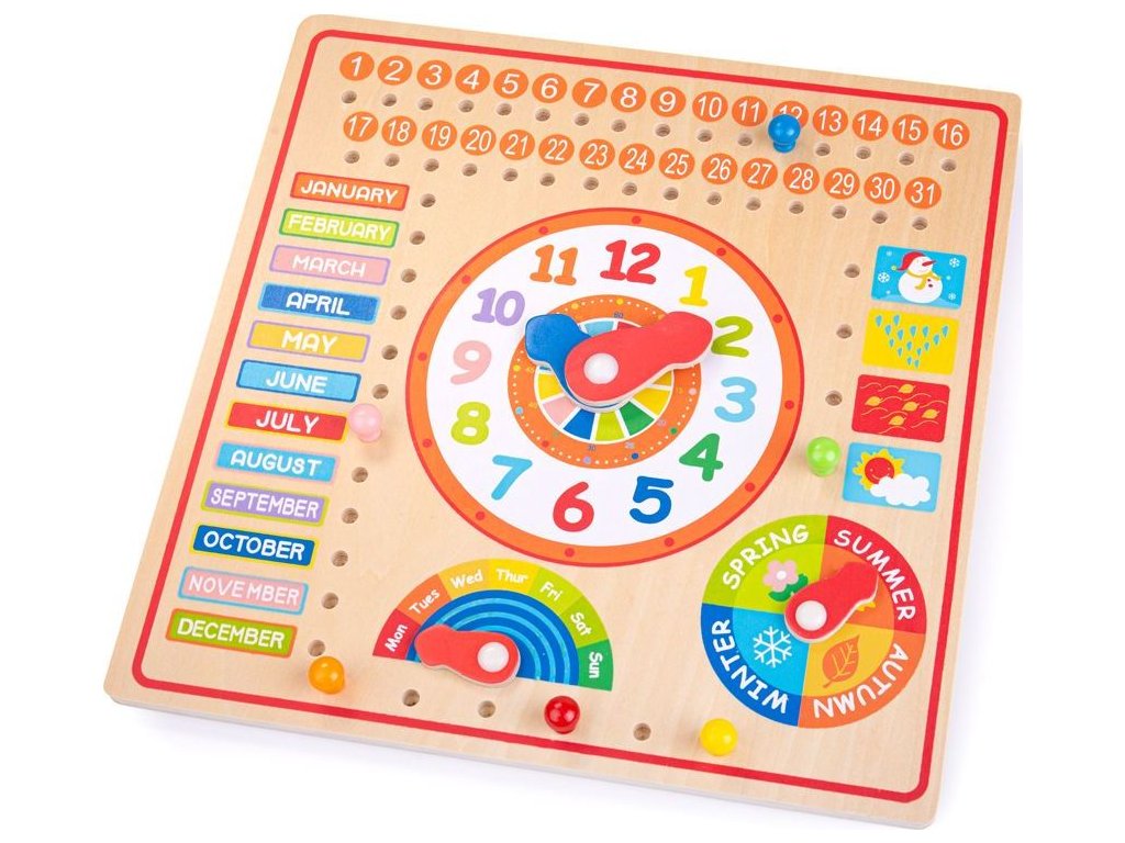 Naše dřevěné hodiny a kalendář jsou plné zábavných funkcí a příležitostí k učení. Naučte se rozlišovat čas pomocí velkých hodin a různé měsíce a dny v týdnu. Tato vzdělávací hračka obsahuje velké hodiny, dny, měsíce a roční období s ciferníky a bodovými ukazateli. Fantastický doplněk do každého dětského pokoje či herny, protože je to skvělá naučná zábava. Naše dřevěné hodiny pomáhají rozvíjet dětskou zručnost , koncentraci a všeobecné znalosti . Vyrobeno z vysoce kvalitních, zodpovědně získaných materiálů. Splňuje aktuální evropské bezpečnostní normy. Hlavní vlastnosti: obsahuje posuvné ciferníky a bodové ukazatelezákladní deska s popisy v angličtinězábavné učení se o počasí, ročních obdobích, datech, kalendáři a poznávání času