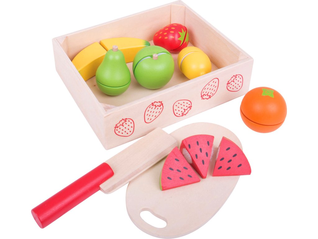 Tato pestrobarevná přehlídka dřevěných hraček obsahuje výběr různých druhů ovoce, které lze opatrně a přesně krájet pomocí dřevěného nože. Zajistíte úplnou bezpečnost Vašeho dítěte, které může krájet ovoce na dodávané dřevěné desce. Skvělý způsob, jak se dozvědět o bezpečnosti kuchyně. Sada obsahuje jablko, hrušku, pomeranč, citrón, jahodu, banán a meloun! Bigjigs Toys dřevěné hračkové jídlo je ideální, aby pomohlo vašemu dítěti dozvědět se o významu zdravé a vyvážené stravy, odkud pochází naše jídlo a jak jej připravujeme. Po skončení hraní může být dřevěná strava uložena zpět do praktického boxu a zajištěna čistým posuvným víkem. Vyrobeno z vysoce kvalitních, zodpovědně dodávaných materiálů. Odpovídá současným evropským bezpečnostním normám. Hlavní vlastnosti: rozvíjí motoriku dítětepraktický box pro uložení hračky