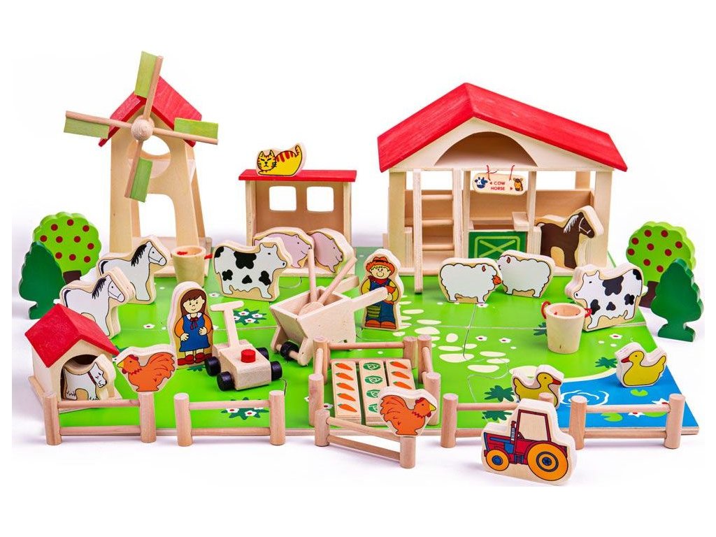 Malí farmáři si mohou vytvořit své vlastní kreativní scény na této velké dřevěné farmě. Obsahuje stáj a větrný mlýn, zeleninový záhon, psí boudu, spoustu zvířat, jezírko a také nářadí a pohyblivé oplocení. Jasné zářivé barvy jsou ideální pro stimulaci představivosti; tato zábavná farmářská hračka poskytne vašemu děťátku hodiny zábavy při objevování venkovského života. Hladké robustní hrací figurky mají ideální velikost pro malé ručičky k uchopení, zkoumání a výměně. Farma je skvělý způsob, jak naučit děti o hospodářských zvířatech, kde žijí a jak se o ně starat. Podporuje kreativní a nápaditou hru. Rozvíjí koordinaci pohybů, jemnou motoriku a zručnost. Vyrobeno z vysoce kvalitních, zodpovědně získaných materiálů. Splňuje aktuální evropské bezpečnostní normy. Hlavní vlastnosti: 48 hracích postaviček a doplňkůfunkční prvky stájeideální pro podporu koordinace a představivostivelké dílky ideální pro dětské ručičkyvyrobeno z vysoce kvalitních, zodpovědně získaných materiálů