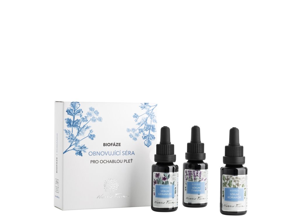 Kompletní sada pro enzymatickou regeneraci vaší pleti se skládá ze séra Geranium, Tymián a Koriandr. Zlepšuje vzhled ochablé pleti a obnovuje její přirozený tonus. Navrací pleti pružnost, oživuje ji a dodává ztracený lesk. Antioxidační účinky synergické směsi éterických olejů ovlivňují aktivitu enzymů, a tak účinně zlepšují stav pleti a zabraňují jejímu předčasnému stárnutí. Rituál Biofáze postupně promění ochablou pleť v projasněnou pleť zářící zdravím.