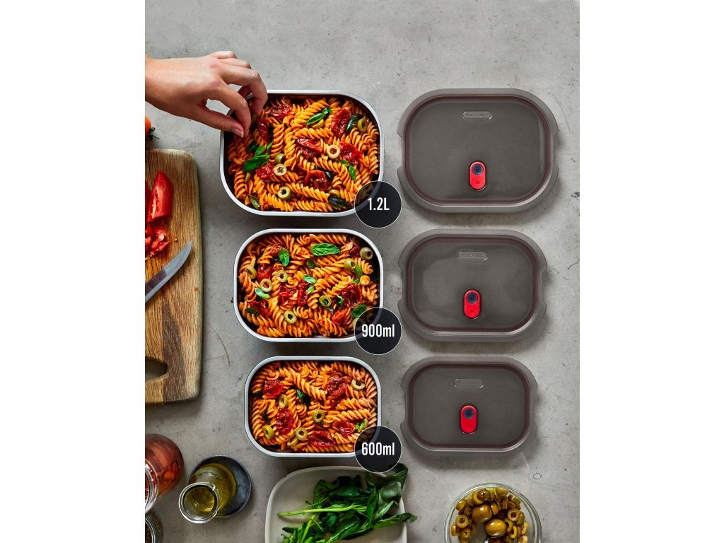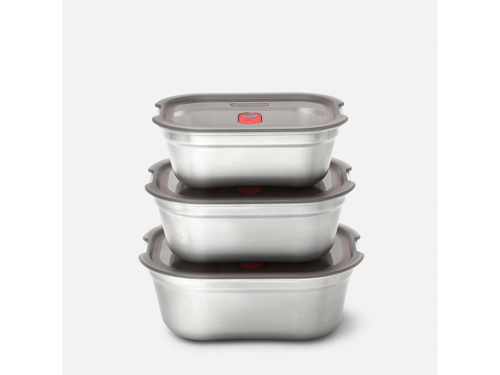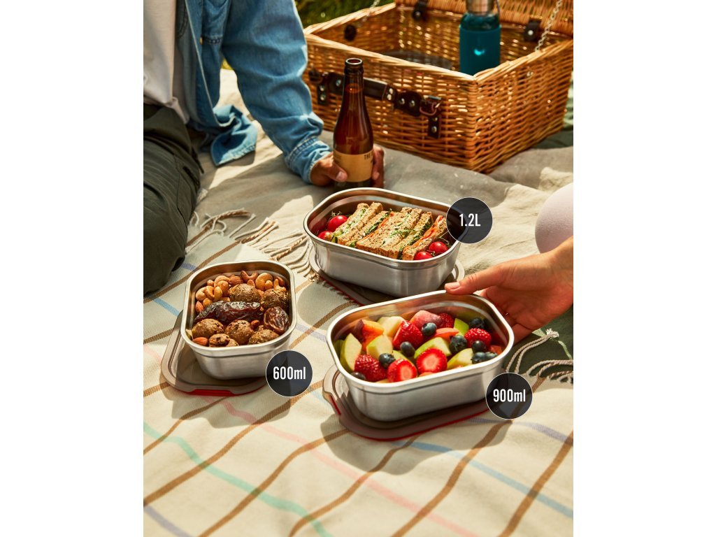 Vybrat si můžete nerezovou krabičku na jídlo a obědy hned ze tří velikostí (600, 900 a 1200 ml). Jednotlivé velikosti perfektně zapadají do sebe, tím ušetříte spoustu místa při skladování. Díky použitému materiálu jsou velmi lehké. Každá obědová nerez krabička se zavírá samostatným polypropylenovým víčkem se silikonovým těsněním a těsnícím ventilkem. Díky tomu jsou 100% vzduchotěsné.