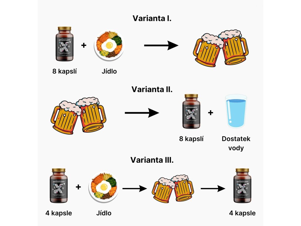 Před večírkem se kvalitně najezte. Během jídla zkonzumujte 8 kapslí BRAINMAX® AFTERPARTY. Během večírku pijte dostatek vody, abyste snížili dehydrataci. Ráno si dejte snídani založenou na sacharidech kvůli nízké hladině cukru v krvi.