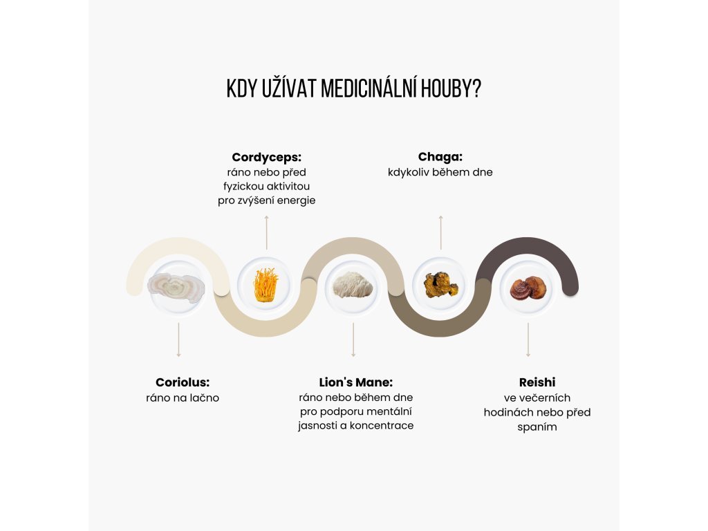 Užívejte 1-2 kapsle denně. 1 kapsle obsahuje 0,5g houbového extraktu. Kapsle užívejte na lačno (min. 30 minut před jídlem či 60 minut po jídle). Při užívání vitálních hub doporučujeme zvýšit příjem vitamínu C, který zvyšuje vstřebatelnost účinných látek. Například ve formě extraktu brazilské třešně Aceroly.