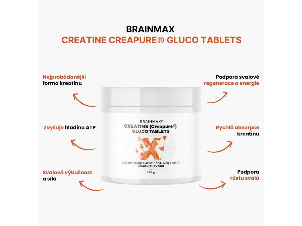 Creapure® Gluco tablets jsou inovativní formou kreatinu monohydrátu, která kombinuje výhody vysoce čistého kreatinu Creapure® s přidanou glukózou pro lepší vstřebávání. Glukóza obsažená v těchto tabletách zvyšuje hladinu inzulínu, což urychluje transport kreatinu do svalových buněk a zajišťuje tak rychlejší a efektivnější regeneraci a zvýšení výkonu. Díky praktické formě tablet není potřeba se obávat přesného dávkování ani míchání, mají skvělou citronovou chuť a můžete si je vzít do kapsy a užívat po celý den.