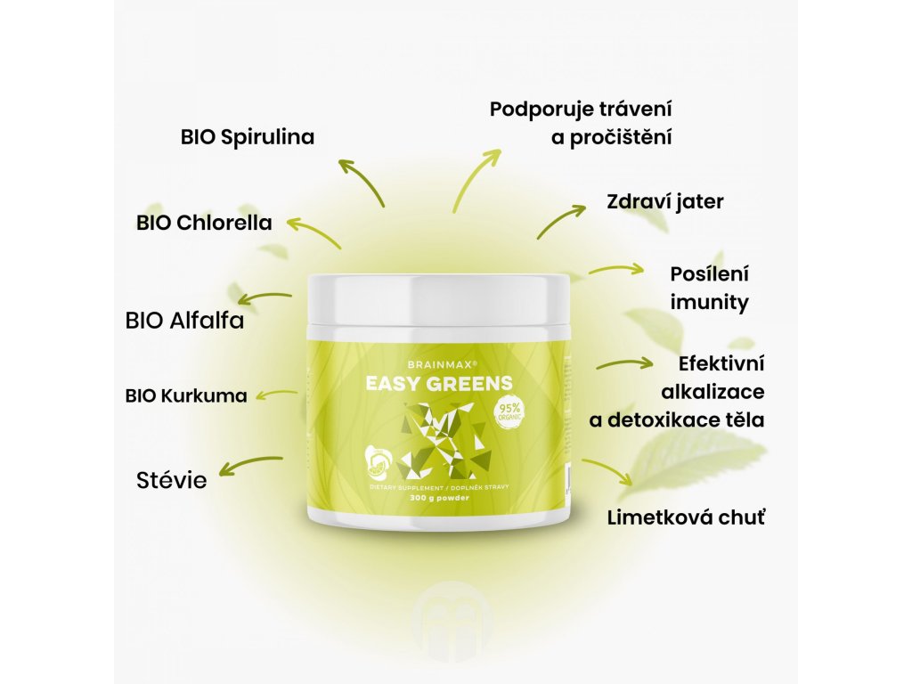 Naše tělo neustále pracuje na odstranění toxinů a nežádoucích látek ze svých různých systémů. V průběhu času se tělo dostane z nezdravých potravin, alkoholu, kofeinu, kouření, stresu a toxinů z životního prostředí do fáze, kdy není schopno všechno z těla vyloučit. Bez ohledu na to, jak zdravá je naše strava nebo životní styl, vnější faktory stále vyžadují, abychom dali tělu šanci načerpat energii. Easy greens je nápoj vyráběný z organických řas chlorelly* a spiruliny*, které spolu se sílou BIO kurkumy* a vojtěšky* obsahují vzájemně se doplňující vitamíny a minerály, díky kterým podpoří vitalitu, energii , trávení, pročištění organismu, funkci jater a díky množství minerálů také alkalizaci organismu a posílení přirozené obranyschopnosti.
