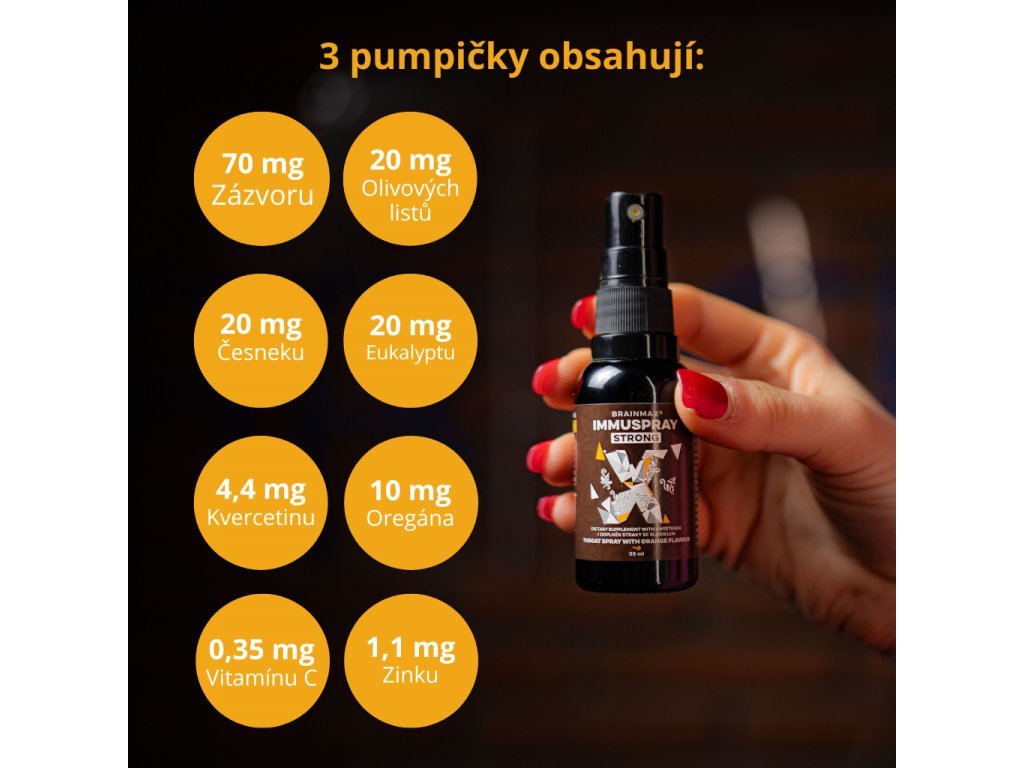 BrainMax ImmuSpray je silný spojenec v boji proti počínajícím příznakům nachlazení a jiných běžných onemocnění. Každá složka byla pečlivě vybrána pro své prospěšné vlastnosti, které posilují slizniční imunitu, uvolňují dýchací cesty, tlumí bolest v krku a pomáhají tělu rychleji se zotavit. Kombinace přírodních ověřených ingrediencí, jako je oregano, česnek, zázvor, kvercetin a extrakt z olivových listů spolu se zinkem a vitamínem C poskytuje maximální účinnost. Nečekejte, až vás onemocnění zaskočí - buďte připraveni.