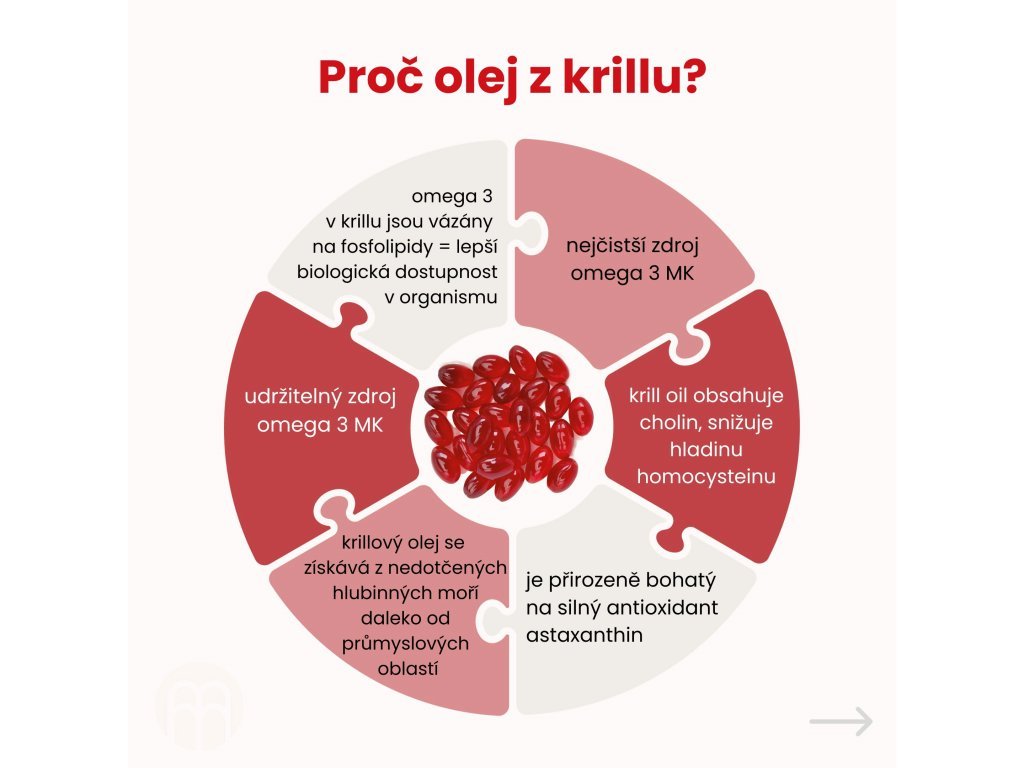 Krill oil je považován za nejčistší zdroj omega-3 mastných kyselin a díky přirozeně obsaženém astaxanthinu přispívá ke zdraví mozku i očí. Omega-3 v krillu jsou vázány na fosfolipidy, které stabilizují omega-3, EPA a DHA a zvyšují jejich biologickou dostupnost organismu. Kromě toho cholin obsažený v krillovém oleji přispívá k normálnímu metabolismu homocysteinu a tuků a k udržení normální funkce jater.