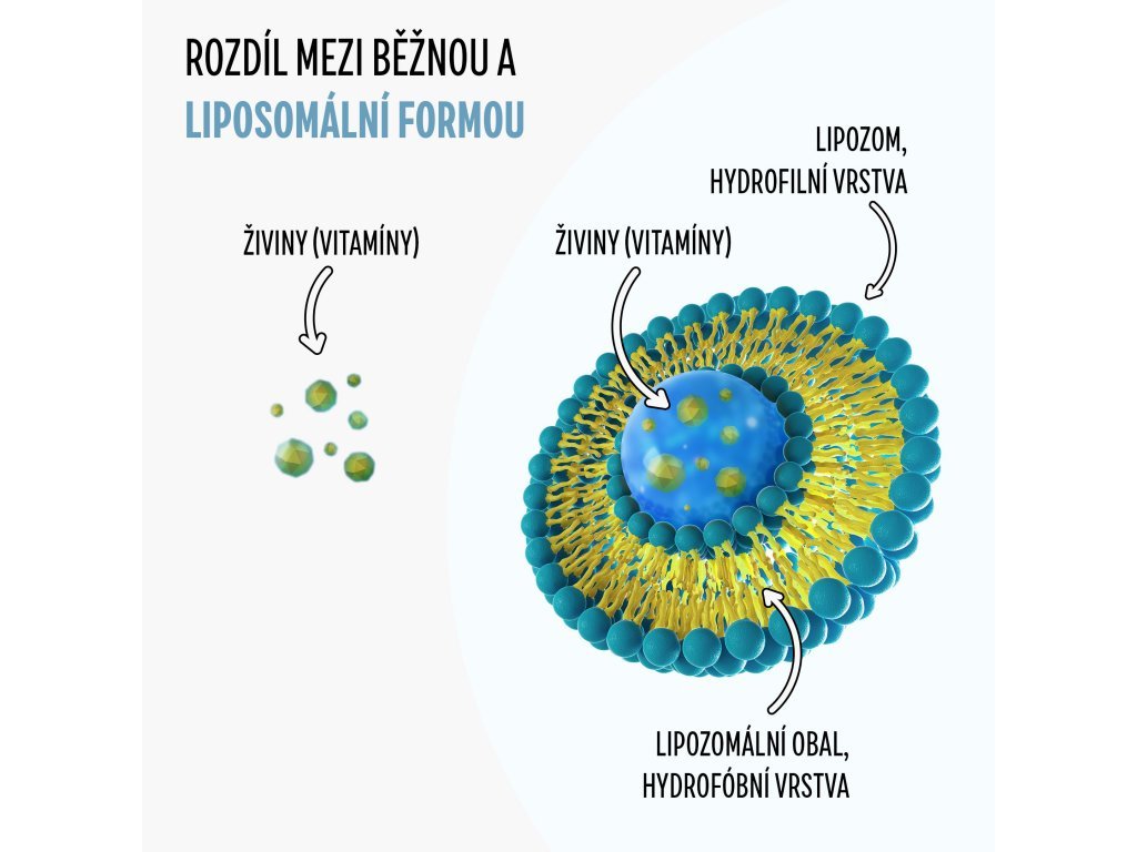 Lipozomy jsou složeny z přírodních fosfolipidů, které jsou základními stavebními kameny všech našich buněk, proto přes stěny buněk prochází zcela bez problému tzv. pasivním transportem. Přirozeně se lipozomy vyskytují např. v kolostru a mateřském mléce, kde je maximální absorpce a využitelnost naprosto nezbytná. Díky své struktuře lipozomy chrání vitamíny před rozkladem v trávicím systému a umožňují jejich přímý transport do buněk. Tyto lipozomy, lépe řečeno fosfatidylcholin, ze kterého je lipozom vyroben, následně využije tělo k výrobě nových buněk. Tento způsob dodání zvyšuje biologickou dostupnost vitamínů, což znamená, že tělo získá více živin z každé dávky ve srovnání s běžnými formami doplňků.