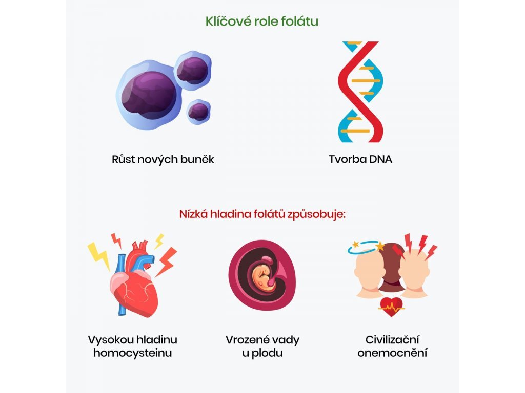Aby byla suplementace kyseliny listové skutečně efektivní, musí být v aktivní formě. Ve formě, kterou dokáže naše tělo okamžitě využít. Neaktivní formy musí být totiž nejdříve přeměněny neboli methylovány játry, aby se staly aktivními a tělo je mohlo vstřebat a využít. Nedostatek folátu se může projevit úbytkem na váze, nechutenstvím, fyzickou slabostí a únavou, bušením srdcem, bolestmi hlavy, podrážděností a častým nachlazením.