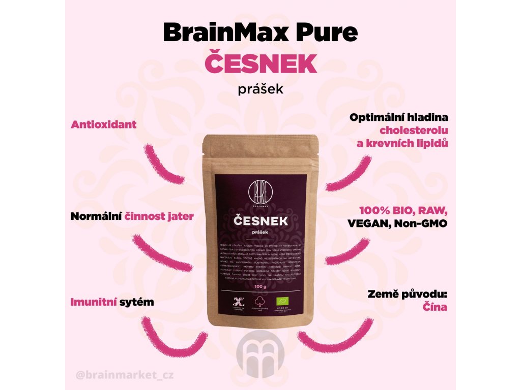 BrainMax Pure česnek je v BIO kvalitě, to znamená, že neobsahuje žádné pesticidy ani jiné škodlivé látky a je pěstován v souladu s ekologickým zemědělství. Po sklizni je šetrným a pomalým způsobem usušen a v podobě prášku jej můžete použít k dochucení pokrmů.