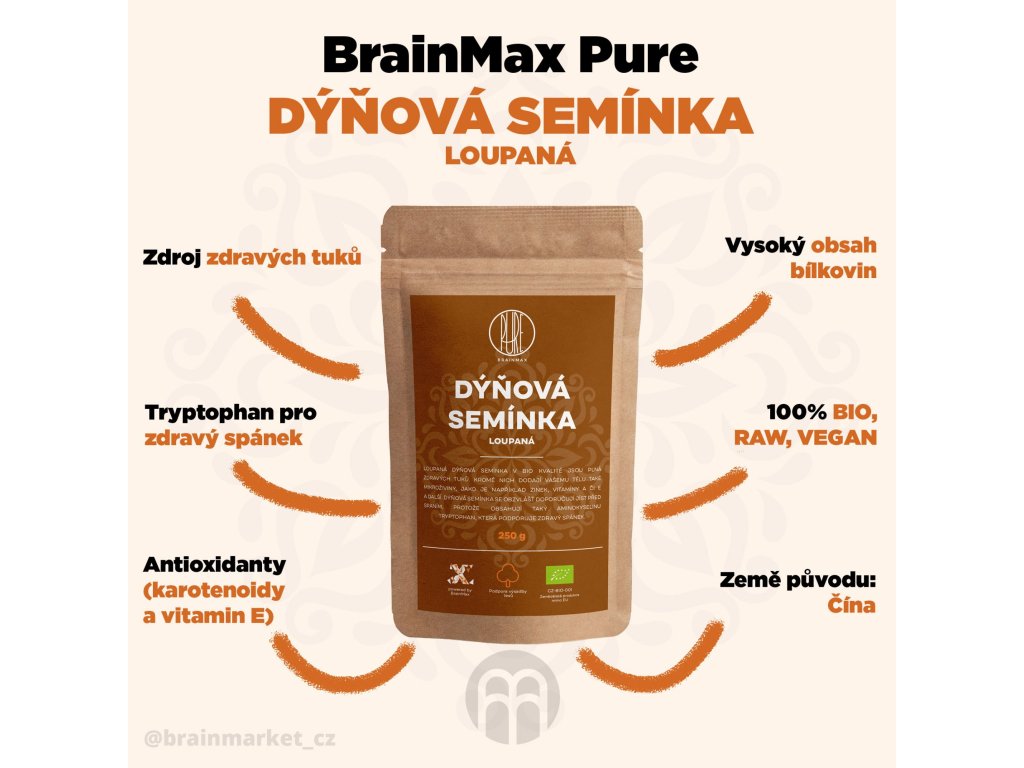 Také jsou zdrojem aminokyseliny tryptophan, která podporuje zdravý spánek a z minerálů jsou velmi bohatá na zinek. Minerál, který je nezbytný pro zdraví vlasů, zubů a nehtů. Semínka jsou zbavená slupky a jsou v BIO kvalitě. Pokud budete chtít ze semínek využít co nejvíce, doporučujeme namočit na několik hodin do vody. Semínka pak budou lépe stravitelná a tělo z nich vstřebá více živin. Semínka obsahují nenasycené mastné kyseliny, především omega 3 a kromě zinku jsou plná vápníku, železa, fosforu, selenu a draslíku.