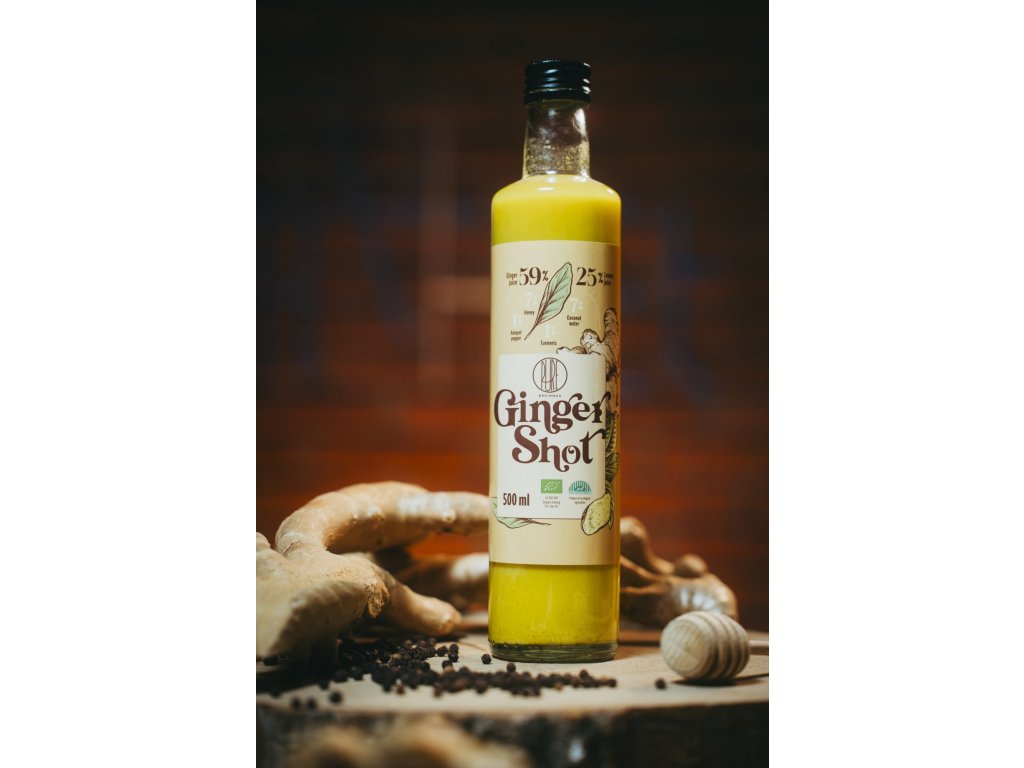 (59%) Zázvorová šťáva*, (25%) citrónová šťáva*, (7%) kokosová voda*, (7%) med*, (1%) kurkuma*, (1%) pepř*. *produkt z ekologického země. Obsahuje 100% surovin v BIO kvalitě. Datum spotřeby (číslo šarže) uvedeno u čárového kódu.