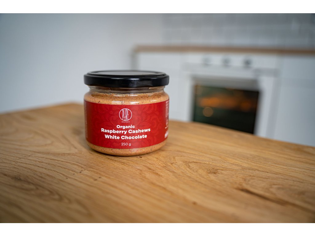 V našem kešu krému nenajdete palmový olej, přidaný cukr, ani jiná aditiva. Krém obsahuje pouze kešu ořechy v bio kvalitě, maliny a bílou čokoládu.