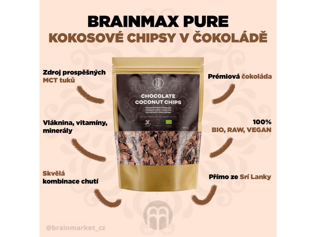 BrainMax Pure Kokosové chipsy v čokoládě BIO, 250 g