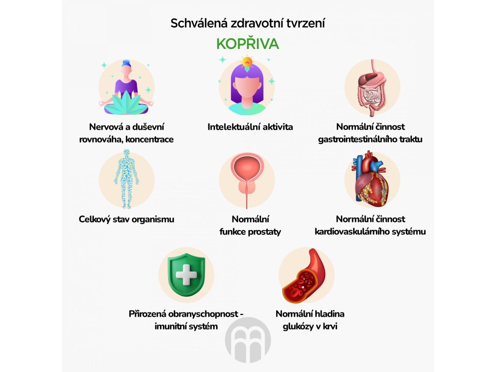 Kopřiva především napomáhá funkci jater a ledvin. Má diuretické (močopudné) vlastnosti a tím pomáhá vylučování vody z těla. Podporuje činnost cévní soustavy, zvlášť při pocitu "těžkých nohou", pomáhá udržovat zdraví kostí, kloubů, vlasů, pokožky a nehtů. Taktéž podporuje peristaltiku střev a u mužů příznivě působí na prostatu.