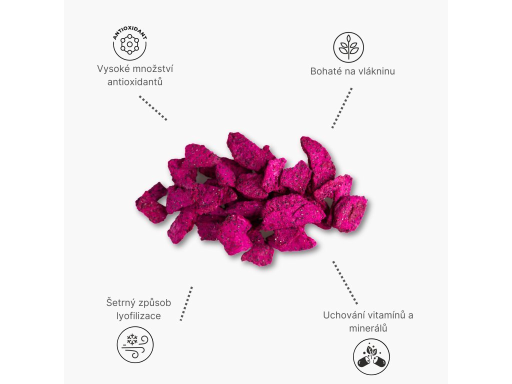 Lyofilizace je šetrná metoda sušení ovoce mrazem, při níž dochází k odstranění téměř veškeré vody prostřednictvím sublimace. Tento proces umožňuje zachovat specifickou chuť, barvu a především důležité vitamíny a minerály dračího ovoce. Kromě toho si lyofilizované ovoce uchovává dlouhou trvanlivost a křupavou konzistenci. Lyofilizované dračí ovoce je ideální jako přísada do snídaňových kaší, smoothie, nebo jako samostatná zdravá svačina plná exotické chuti.