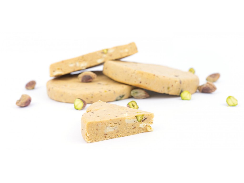 V sušence jsou křupavé kousky BIO pistácií, které jsou zdrojem kvalitních tuků s vysokým podílem nenasycených mastných kyselin a vitamínů skupiny B.