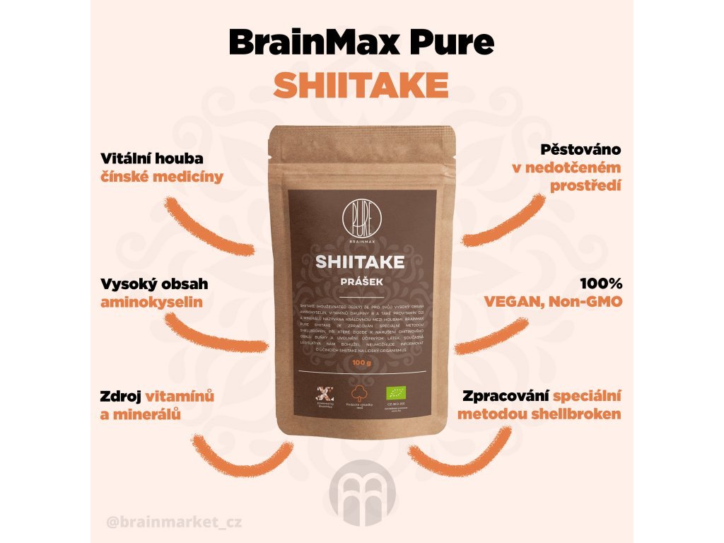 BIO Prášek z plodnice Lentinula edodes (biomasa/powder). Neobsahuje kofein, lepek, konzervační látky, barviva ani cukr.