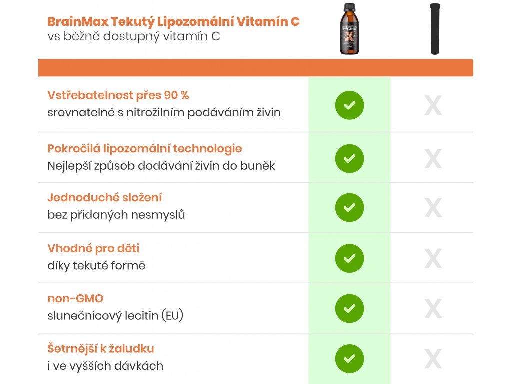 Vitamín C je zapouzdřen v nano částicích zvaných lipozomy a díky tomu dokáže projít skrz stěnu tenkého střeva a dostat se do krevního řečiště. Běžné formy vitamínu C střevní bariéru překonávají jen s velkými obtížemi a proto se vstřebá do krevní plazmy pouze 7 až 14 % vitamínu C. Proto je lipozomální vitamín C jasnou volbou pro všechny, kteří potřebují podpořit organismus během nemoci a chtějí posílit celkovou imunitu. Vstřebatelnost lipozomálního vitamínu C je až 95%.