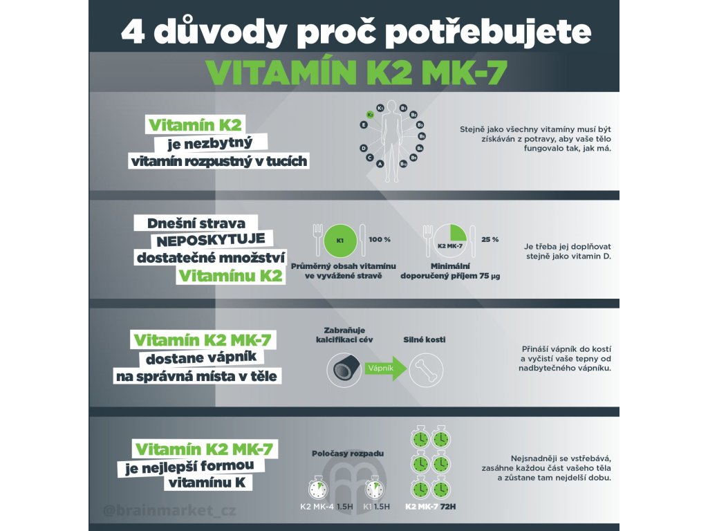 1 kapsle obsahuje 5000 IU vitamínu D3 (cholekalciferol z lanolinu) a 150 mcg vitamínu K2 jako MK7.