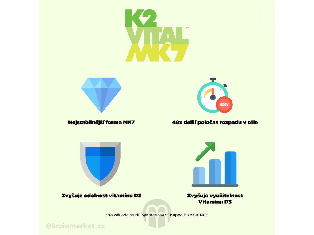 Použitá je patentovaná forma K2 MK7 – K2VITAL®DELTA, vyráběná německou společností Kappa Bioscience.