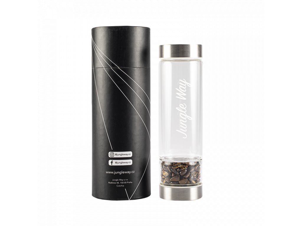 Designová skleněná láhev Jungle Way s tygřím okem II. je nejenom skvělým prostředkem pro připomenutí si, jak zásadní roli ve zdravém životním stylu hraje hydratace, ale zároveň dává možnost každému z nás, užitím kohoutkové vody, ulevit planetě Zemi od jednorázových plastů, kterých se pouze v roce 2019 celosvětově prodalo víc než 480 miliard kusů, stejně tak ušetřit 99% oproti ceně balené vody.