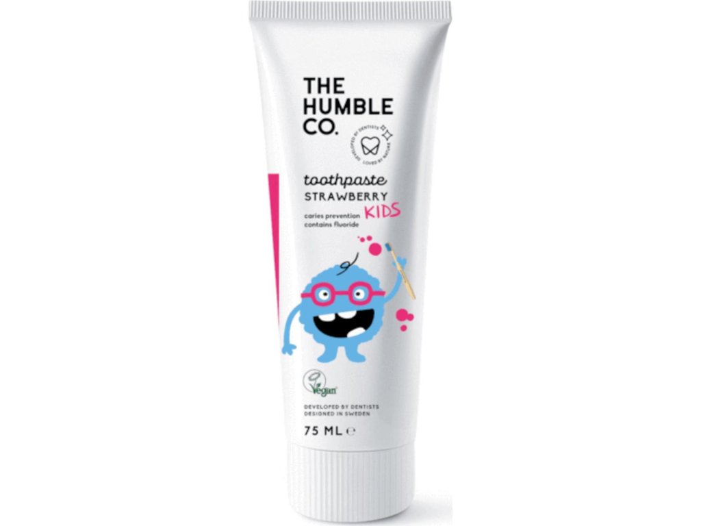 Dětská zubní pasta s fluoridem a jahodovou příchutí pro zdravou ústní dutinu a zoubky jako perličky.