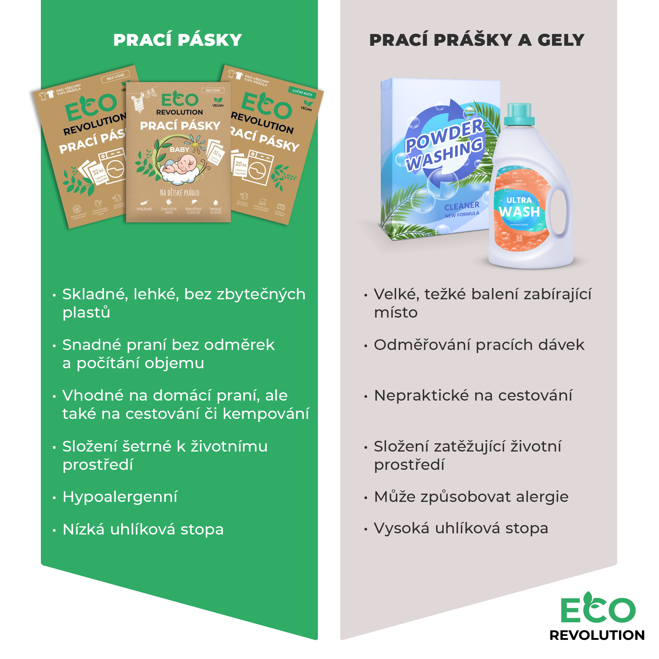 EcoRevolution prací pásky jsou skvěle koncentrovaný prací prostředek bez vody, který je zcela bez alergenů, parabenů a fosfátů. Balení pracích pásků Vám nejen ušetří spousty místa v koupelně, ale oproti klasickým pracím gelům či práškům jsou lehké, skladné a snadno si je přibalíte třeba na dovolenou nebo na výlet.