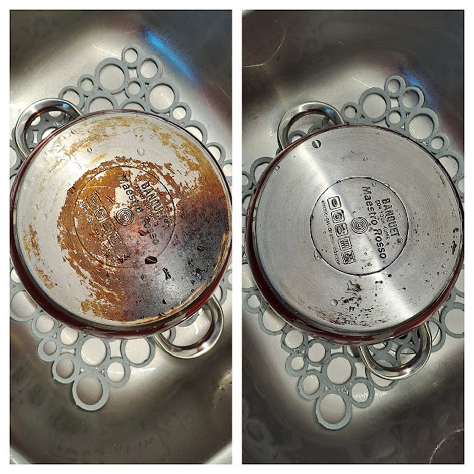 Takto si písek poradí s velkou připáleninou na spodní straně hrnce. Pravda, při takovém znečištění už to chce trochu času a námahy, ale výsledek určitě stojí za tu snahu. Houbička se pak jednoduše vymyje vodou od nečistot a je jako nová a připravená na další použití. Navíc se nijak při častém používání netrhá nebo nedeformuje, jako třeba běžné houbičky na nádobí.