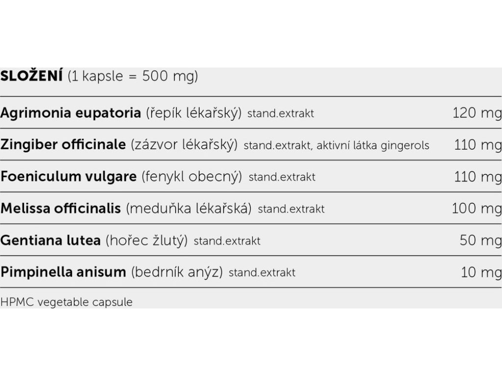 Řepík lékařský (Agrimonia eupatoria), Zázvor lékařky (Zingiber officinale), Fenykl obecný (Foeniculum vulgare), Meduňka lékařská (Melissa officinalis), Hořec žlutý (Gentiana lutea), Bedrník anýz (Pimpinella anisum).