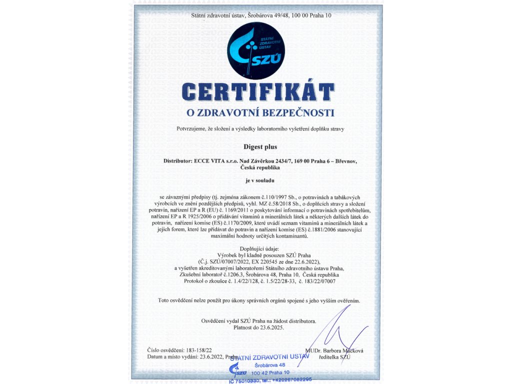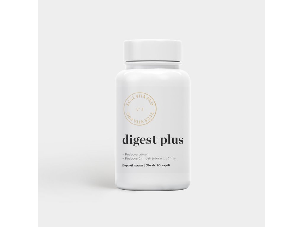 Ecce Vita® Digest plus obsahuje 90 kapslí z rostlinné celulózy ve kterých je směs standardizovaných extraktů částí bylin, které svým synergickým působením podporují trávicí systém. Agrimonia eupatoria (řepík lékařský) podporuje normální činnost jater, žlučníku a vylučování. Gentiana lutea (hořec žlutý) a Melissa officinalis (meduňka lékařská) podporují trávení. Foeniculum vulgare (fenykl obecný) pomáhá trávení a detoxikaci, pomáhá při kojení. Zingiber officinale (zázvor lékařský) je antioxidant, podporuje imunitní systém, má vliv na trávení a normální hladinu cukru v krvi. Bez lepku, bez laktózy, bez sóji, no GMO, vegan. Obsah: 90 kapslí Čistá hmotnost: 55,5 g