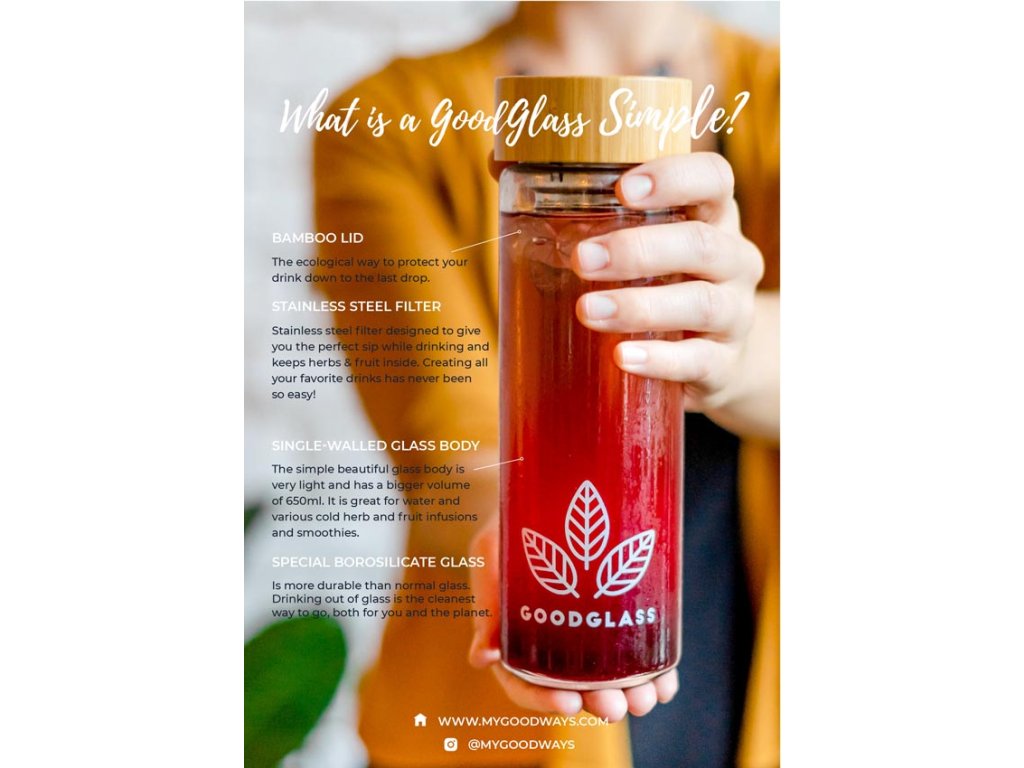 GoodGlass Simple je stvořena pro ty, kteří chtějí lehčí a zároveň objemnější lahev, která by jim pomohla dodržovat pitný režim v průběhu celého dne. Filtr při pití zadržuje ovoce a bylinky v lahvi a zároveň poskytuje dokonalý doušek. Umožňuje vám být kreativní a jednoduše vytvářet krásné a chutné infuze a smoothie.