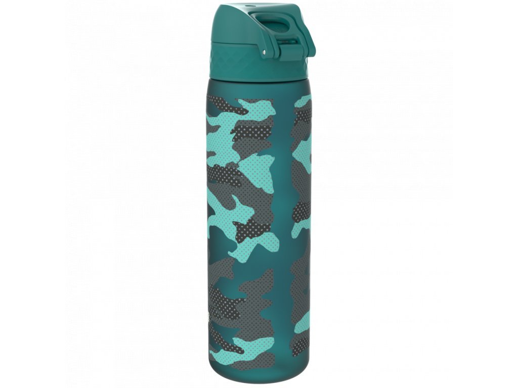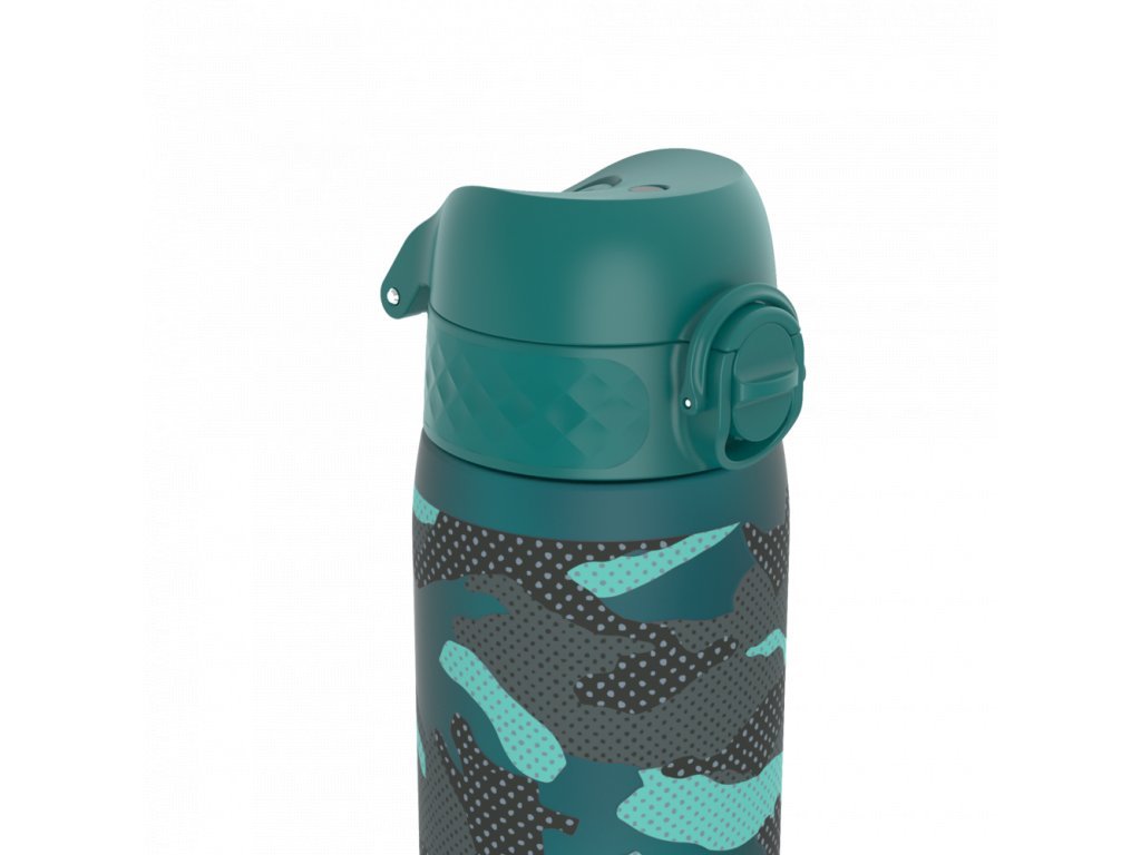 Jedním dotykem otevíratelná, 100% těsnící univerzální láhev na nápoje Ion8 z odolného, zdravotně nezávadného materiálu Recyclon s maskáčovým vzorem.