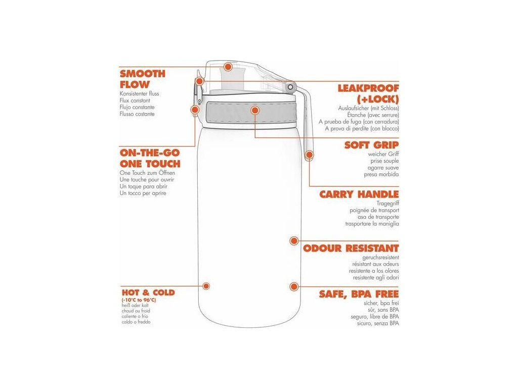 Lahve Ion 8 jsou opatřeny unikátním otevíracím systémem One Touch. Tento systém chrání pítko, neumožňuje tekutině protéci ven a navíc jej lze snadno otevřít jednou rukou, což oceníte v mnoha situacích.