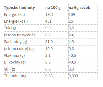 Neobsahuje lepek, vejce, mléko, ořechy, přidané konzervační látky, přidanou sůl, umělá aromata a barviva.