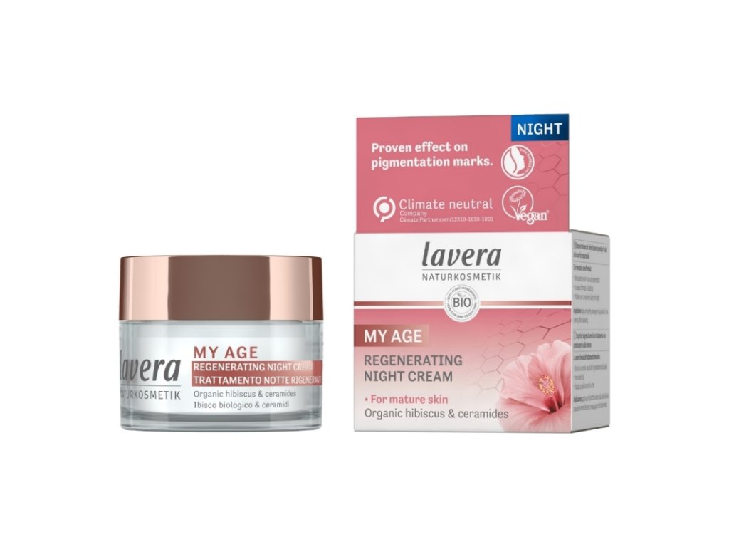 Objevte tajemství řady My Age navržené speciálně pro potřeby zralé pleti žen 50+. Lehké veganské složení krému je obohaceno o přírodní ceramidy, které během noci obnovují přirozenou ochrannou bariéru pokožky. Ta chrání pleť před bakteriemi, předčasným stárnutím a dehydratací. Obsažený Bio Ibišek má tonizující a zjemňující účinky. Pleť je po probuzení hydratovaná a hladká na dotek.