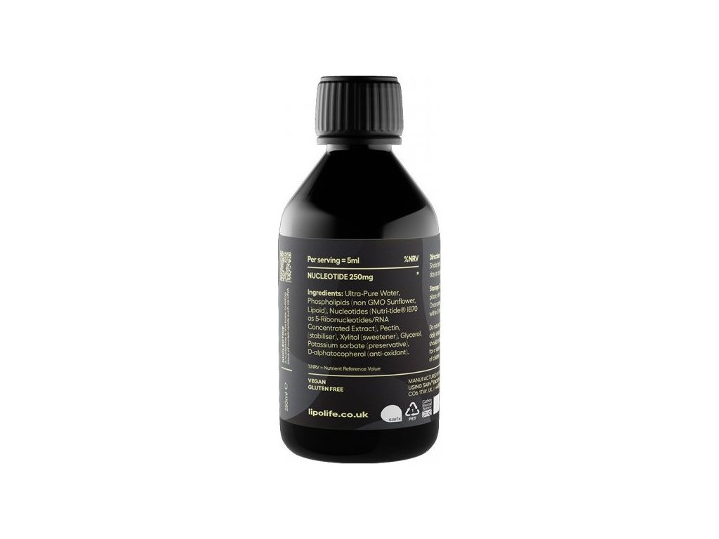 Složení: Nukleotidový komplex (Nutri-tide® IB70 jako 5-ribonukleotidy/RNA koncentrovaný extrakt), fosfatidylcholin ze slunečnicového lecitinu bez GMO, pektin (stabilizátor), xylitol (sladidlo), sorbát draselný (konzervant), vitamín E (antioxidant), stopy glycerolu.
