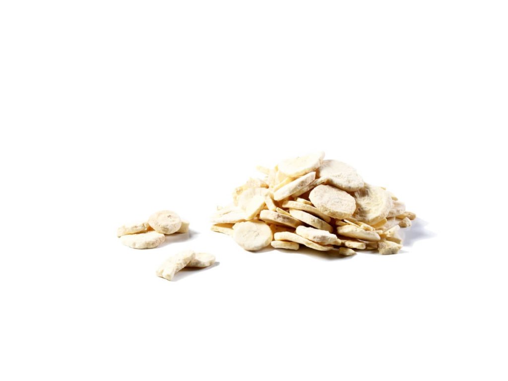 Mrazem sušený banán je sladký, voňavý a krásně křupavý. Při kontaktu s vodou nebo vláhou změkne a navrací se téměř do původního stavu.