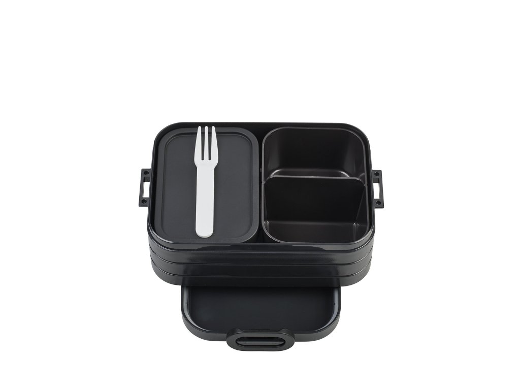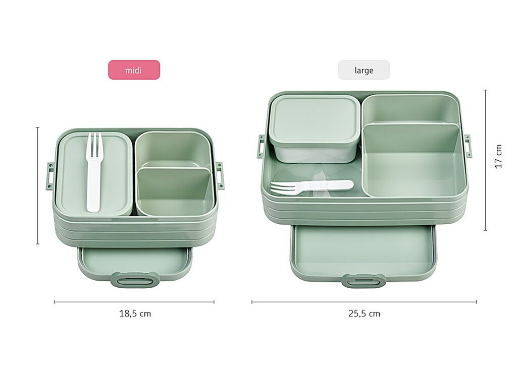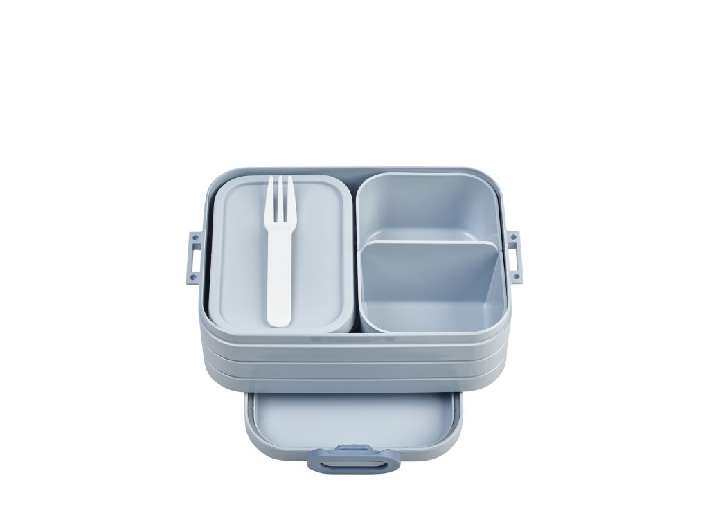 Svačinový bento box Mepal střední velikosti je skvělým pomocníkem na výlety, do školy nebo do práce. Díky dvěma vnitřním boxům si svou svačinu můžete přehledně uložit, nic se nepomíchá, nic se nepomačká, vše zůstane čerstvé a chutné. Svačinový bento box je robustní a díky svému tvaru i velmi pevný. Vnitřní boxy bez víka lze použít pro ohřev jídla v mikrovlnce.