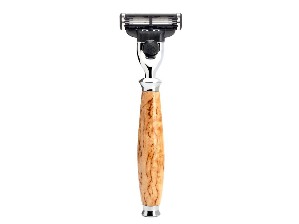 Tento strojek má vyměnitelnou moderní hlavici Gillette Mach 3 a hlavně ručně lakovanou břízovou rukojet z nehostinných severských oblastí. Tam bříza roste velmi pomalu a je to v podstatě takový keřík. Její dřevo má neobvykle zrnitou a žilkovitou strukturu, která po zpracování a nalakování nádherně vyniká. Kovové objímky vyrobené z chromu.